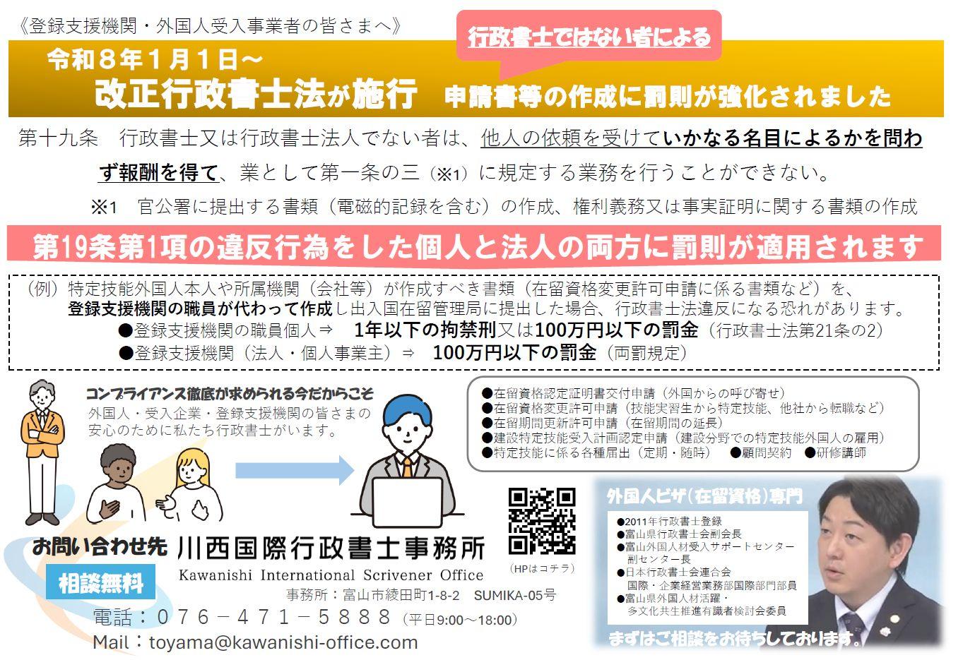 令和7年6月13日に行政書士法の一部を改正する法律(令和7年法律第65号)が公布され、令和8年1月1日より施行されました。